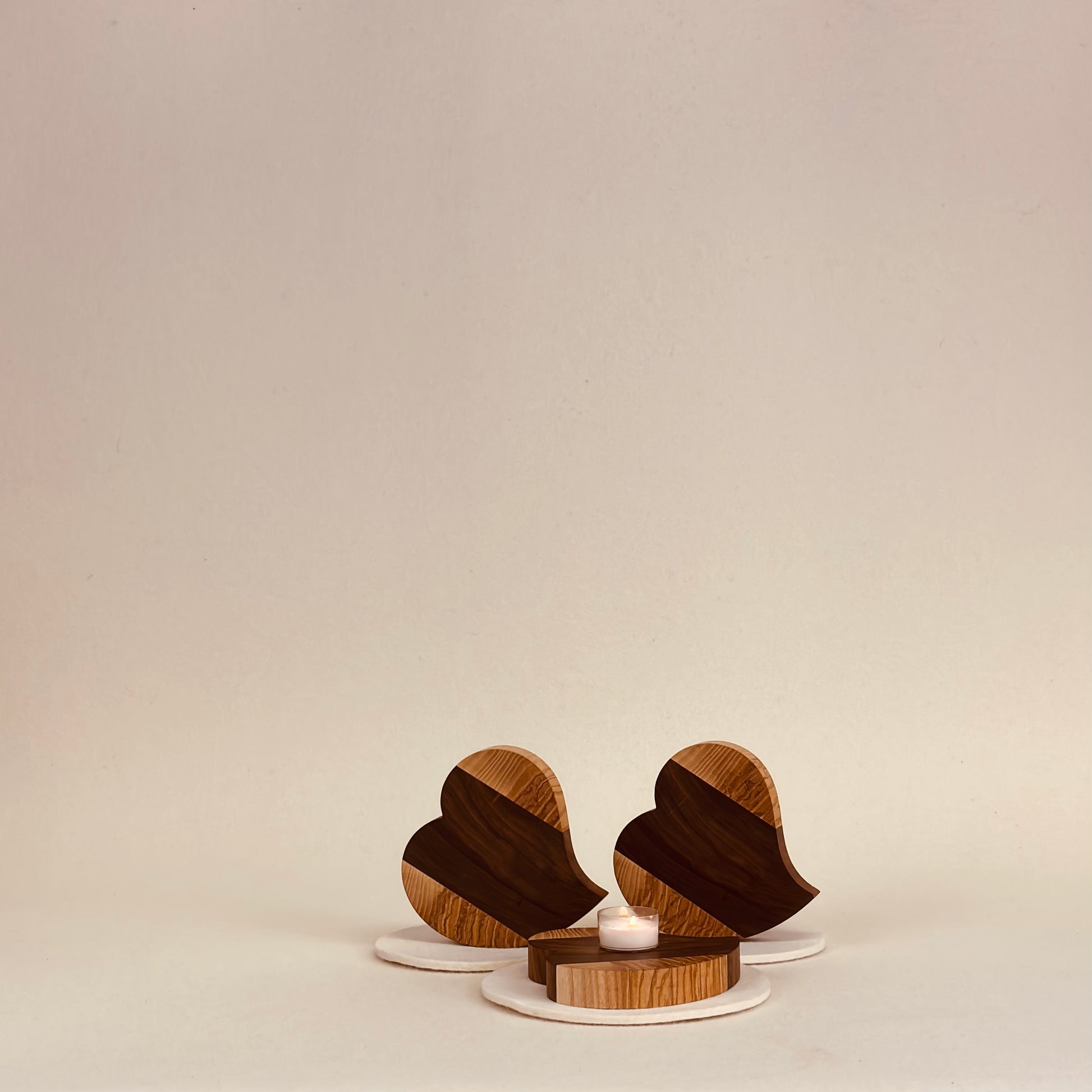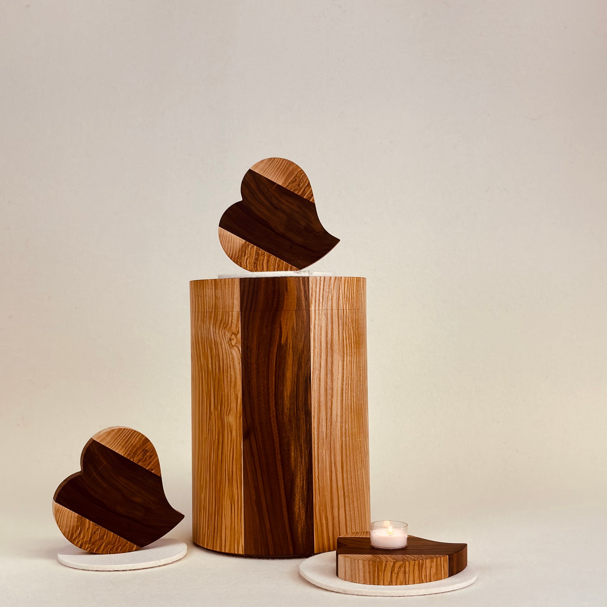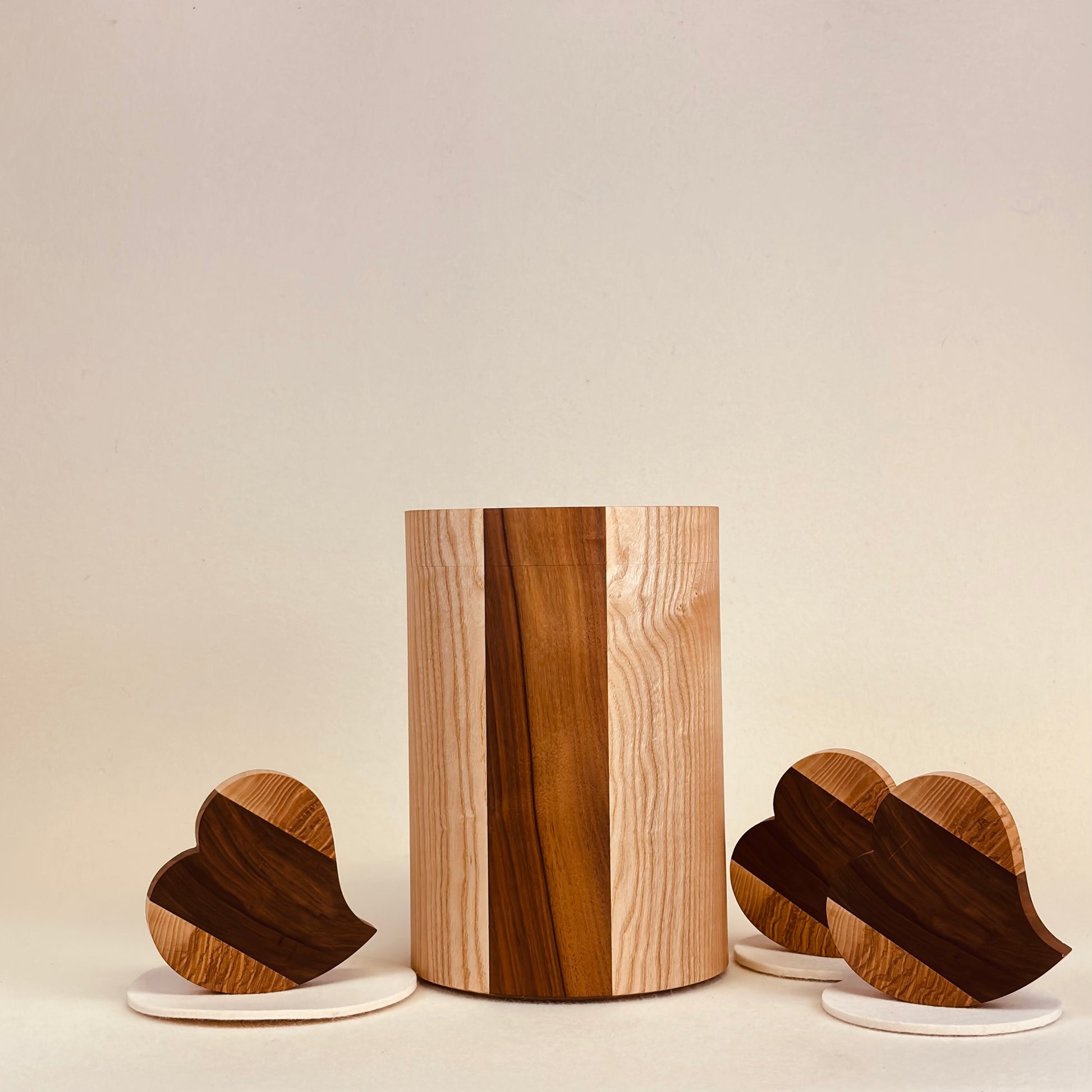 Holzurne in Esche mit Nussbaumstreifen "Engelurne" Herzscheiben (3 Stück) - 186